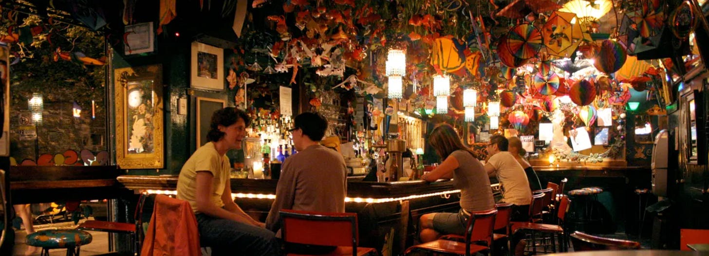 If you want to revel in being single, with all its incumbent freedoms, New York is a great city to be in. There is, truly, a different thing to explore every night of the week. Newly unattached, with absolutely no intentions of locking myself down again, I ended up going out almost every night — a pace I would maintain for years. Mind, I wasn’t a club kid. Bars had long been my venue of choice. Clubs felt like a sensory overload; bars — especially dive bars — were cozy and contained.