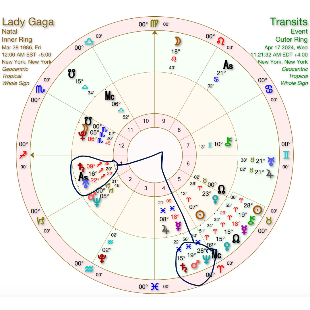 So, for example: folks with natal Saturn in Sagittarius in their birth chart are currently undergoing their opening Saturn square, since Saturn is in Pisces (which, like Sag, is a mutable, end-of-season sign). If we look at Lady Gaga’s birth chart below, we’ll see that Saturn in the sky is “squaring” the Saturn placement she had when she was born. (Please note we do not have an accurate birth time for Lady Gaga, so I just pulled a midnight chart — the rising sign / houses are likely not accurate.)