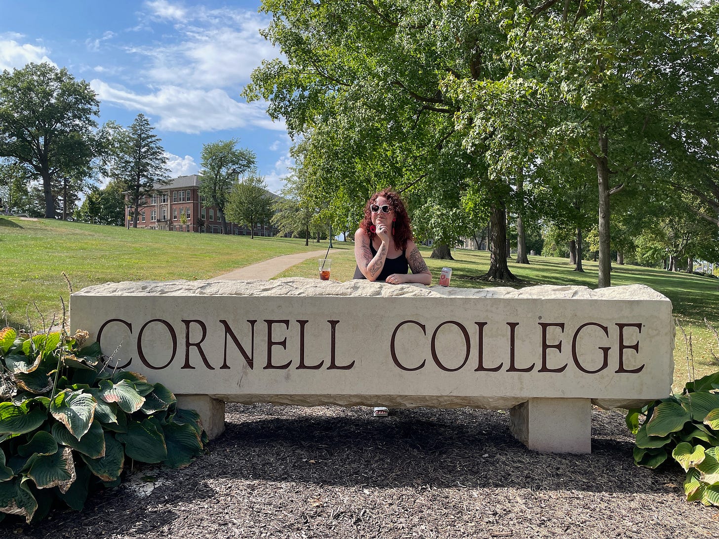 I was invited back to teach memoir as a Visiting Writer at Cornell College in Mount Vernon, Iowa this summer. Cornell is my alma mater, Iowa is my home state, and it was a full circle moment in so many ways. And there were many highs: I got so much time with my dear friend lyz and got to see relatives I haven’t seen in an age. Meg and I made new queer tarot friends in Iowa City. There were house parties and backyard campfires. We spent one memorable evening traipsing through an enormous cemetery under the stars. I am always going to cherish that month — and especially the fact that Meg was there, too, that she got to so fully experience the place that is the root of my heart.